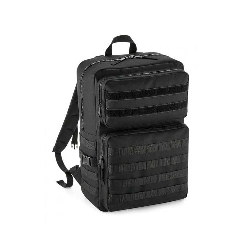 Polyester 600D Étiquette détachable TearAway, facile à ré-étiqueter Style inspiré par les sacs militaires Toile MOLLE double avec Rip-Strip™ Boucle en toile MOLLE Deux grandes poches avant zippées Compartiment principal avec fermeture zippée Pochette interne plaquée