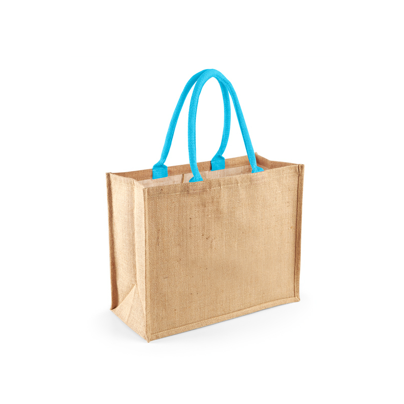 Élégant et résistant, ce sac est confectionné en jute laminé pour une meilleure solidité et une finition soignée. Ses poignées en coton offrent un port confortable, idéal pour un usage quotidien ou vos courses.
