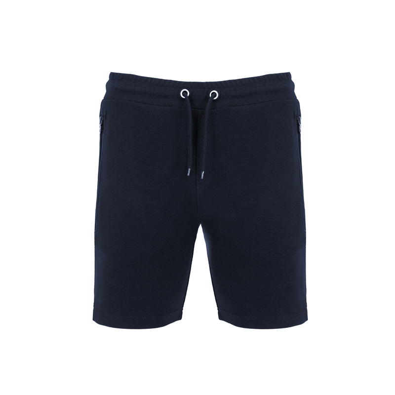Pantalon court avec ceinture élastique et cordon avec oeillets métallique. Deux poches latérales avec fermeture éclaire inversée ton sur ton et curseur. Bande latérale ton sur ton. Braguette cousue. Une poche arrière avec bouton à pression.