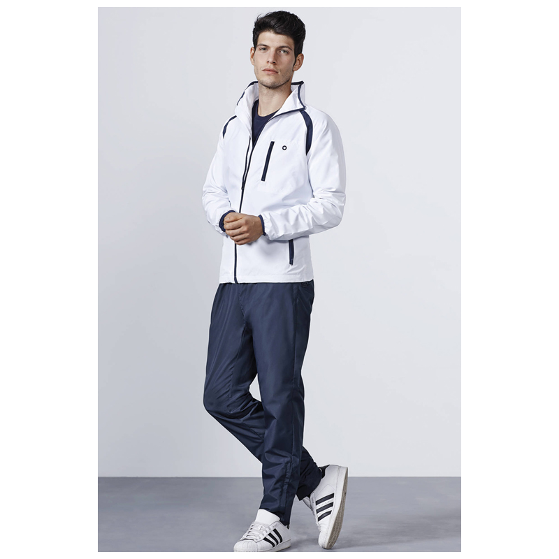 Survêtement homme composé d´une veste et d´un pantalon. Poche en poitrine avec oeillet métallique pour cable audio. Poches avec zip contrasté. Bas avec élastiques. Doublure intérieure filet. Pantalon avec ceinture élastique et cordon de serrage contrasté. Zip sur le bas.